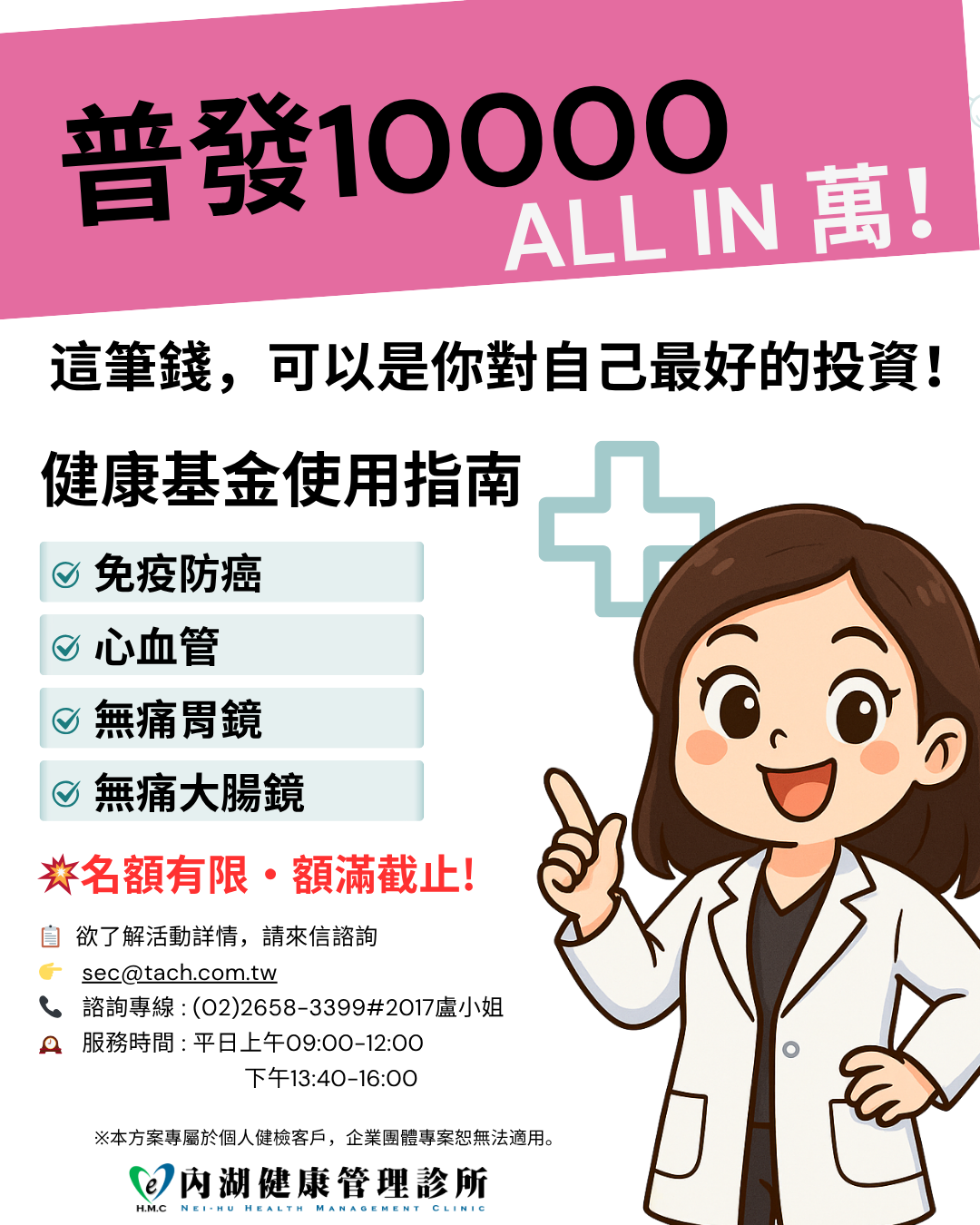 本診所保留隨時修改、變更、暫停或終止本專案活動之權利,並保有最終解釋權;相關資訊請以本診所公告為準。