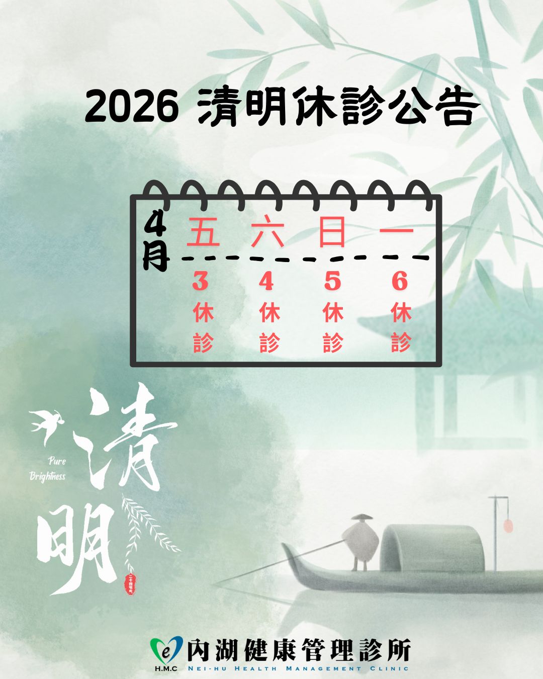 【2026年清明休診公告】 本診所將於 4/3(五) - 4/6(一) 休診四日。 如有不便,敬請見諒! 祝大家連假平安順心! 如需服務請來信留下您的問題,我們將於3/2(一)上班時間儘速回覆您的訊息。 neihu101hmc@tach.com.tw