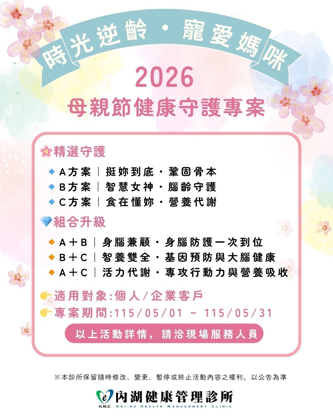 媽媽總是把最好的留給家人, 但健康,也值得被好好照顧。 今年母親節, 把「安心」送給重要的她,也送給自己 精選守護 A方案|挺妳到底・守護骨本 B方案|智慧女神・腦齡守護 C方案|食在懂妳・營養代謝 組合升級 A+B|身腦兼顧・身腦防護一次到位 B+C|智養雙全・基因預防與大腦健康 A+C|活力代謝・專攻行動力與營養吸收 不只是媽媽 每一個努力生活的你,都值得被守護 今年,不只送花 送一份長久的健康 適用對象|個人 & 企業客戶 活動期間|115/5/1-115/5/31 名額有限,敬請把握專案時機! 想了解更多,歡迎洽詢現場服務人員 ※ 本診所保留隨時修改、變更、暫停或終止活動內容之權利,以公告為準