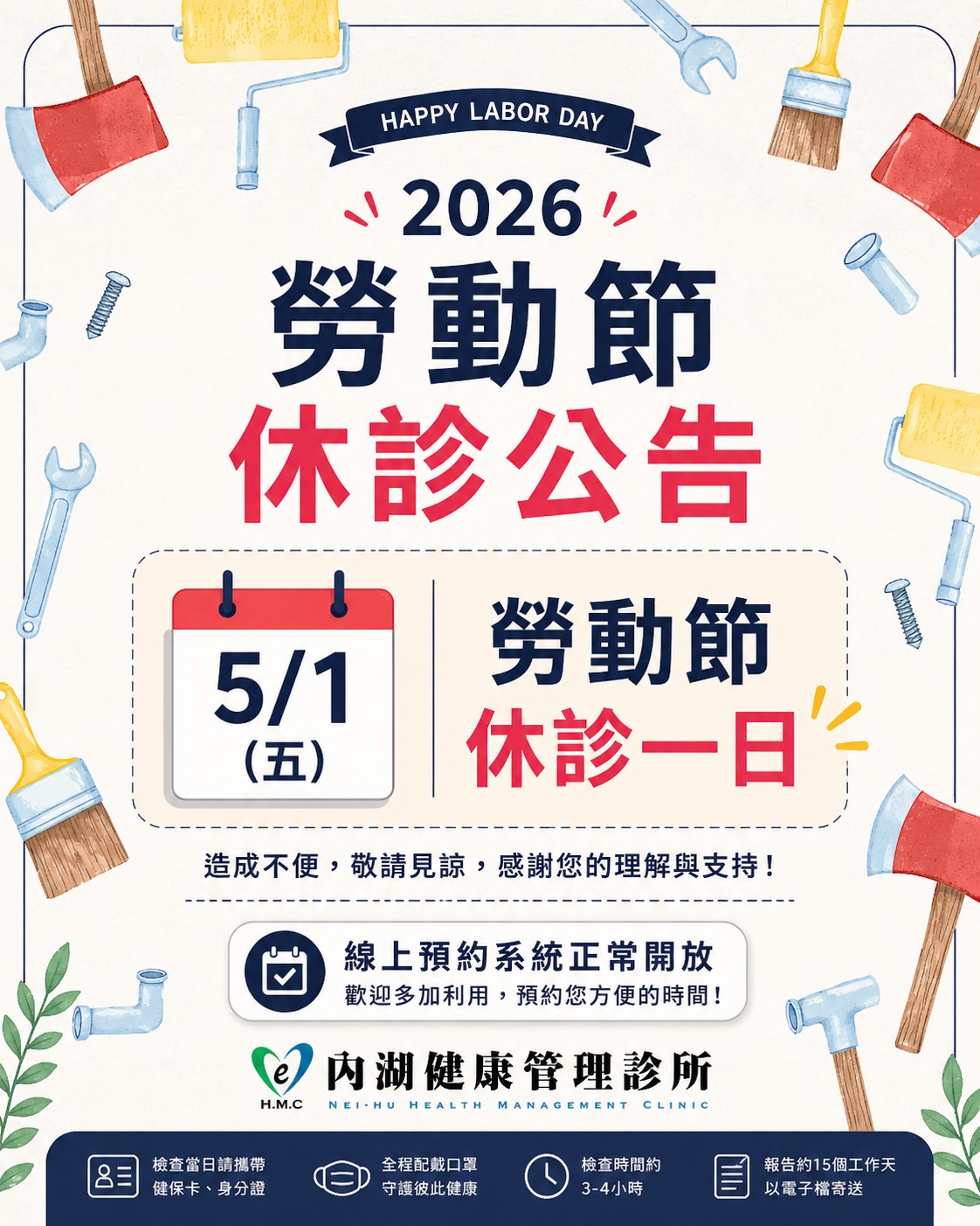 【2026勞動節休診公告】 本診所將於 5月1日(五) 休診一日 如有不便,敬請見諒! ㊗️大家連假平安順心! 如需服務請來信留下您的問題,我們將於5/4(一)上班時間儘速回覆您的訊息。 neihu101hmc@tach.com.tw